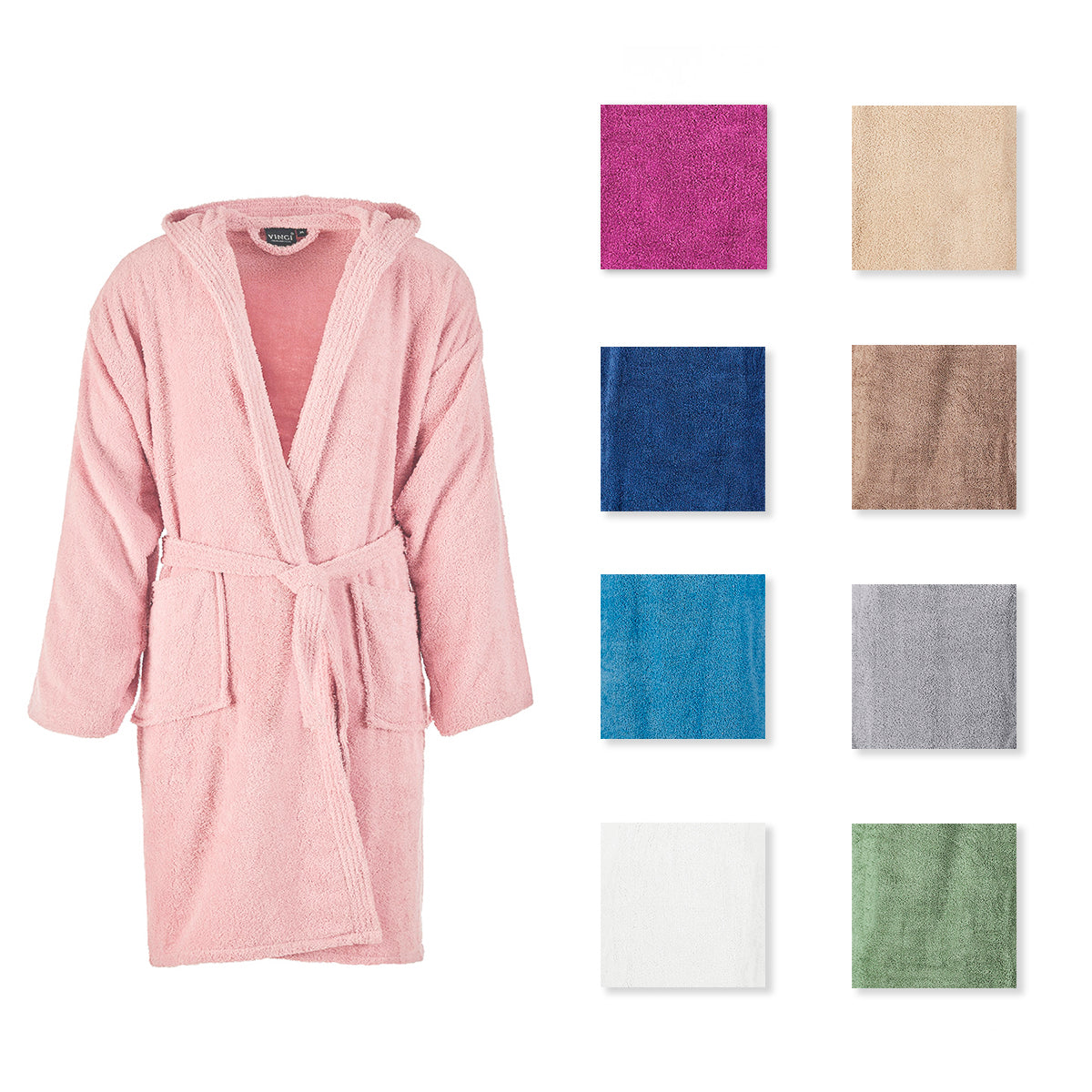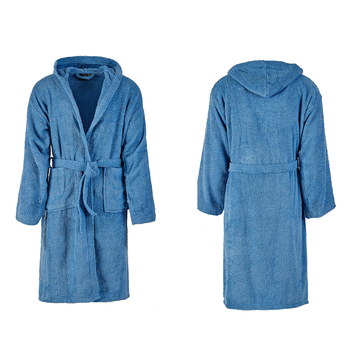 Accappatoio in spugna 100% cotone tinta unita con cappuccio, tasche laterali e cintura.